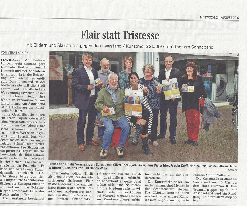LOGO-StadtART-300pxSTADTART ist eine Initiative regionaler Kulturschaffender in Zusammenarbeit mit der Stadt Stadthagen. Dabei zieht die Kunst in ausgewählte, leer stehende oder nicht genutzte Schaufenster ein.